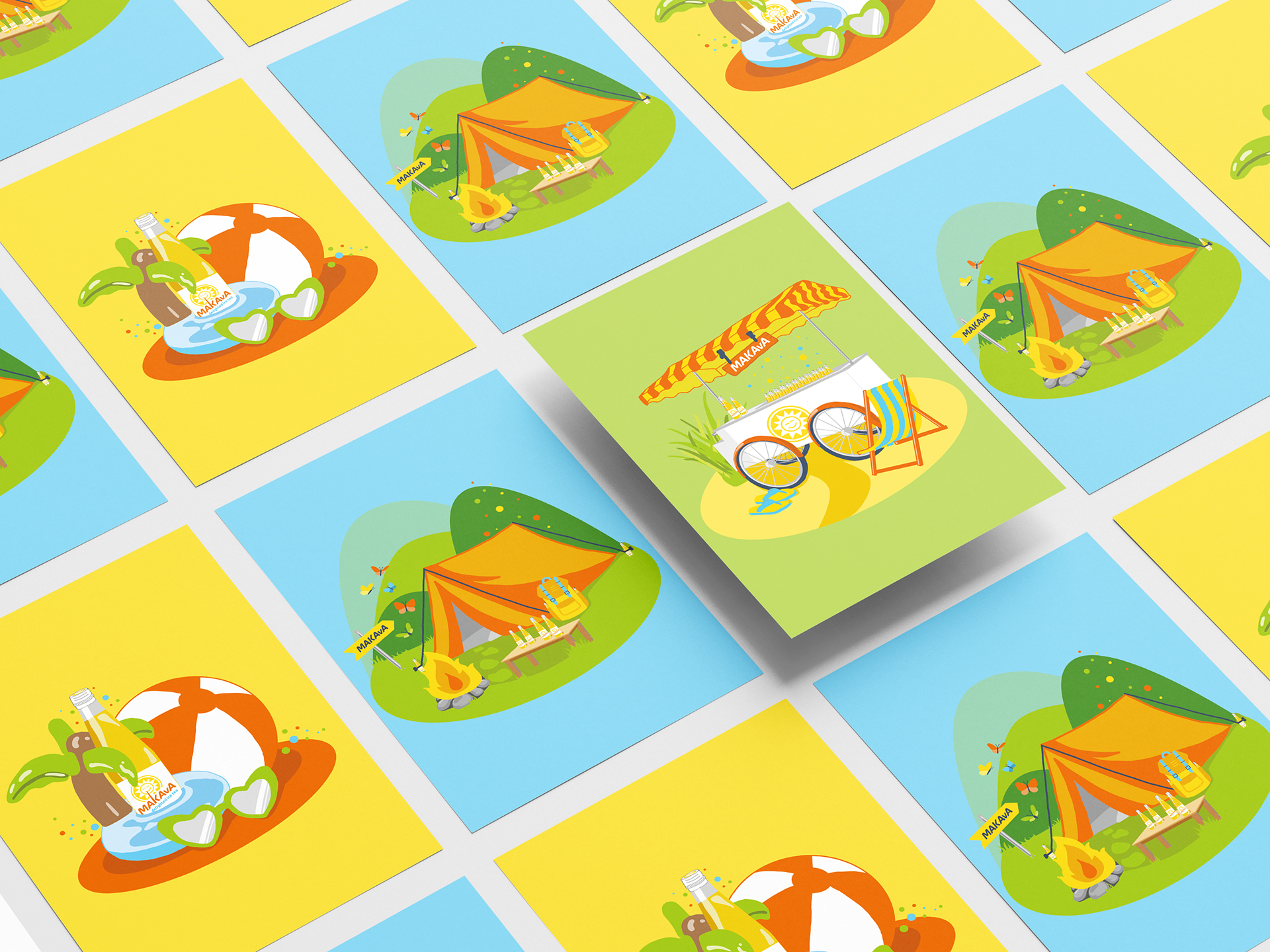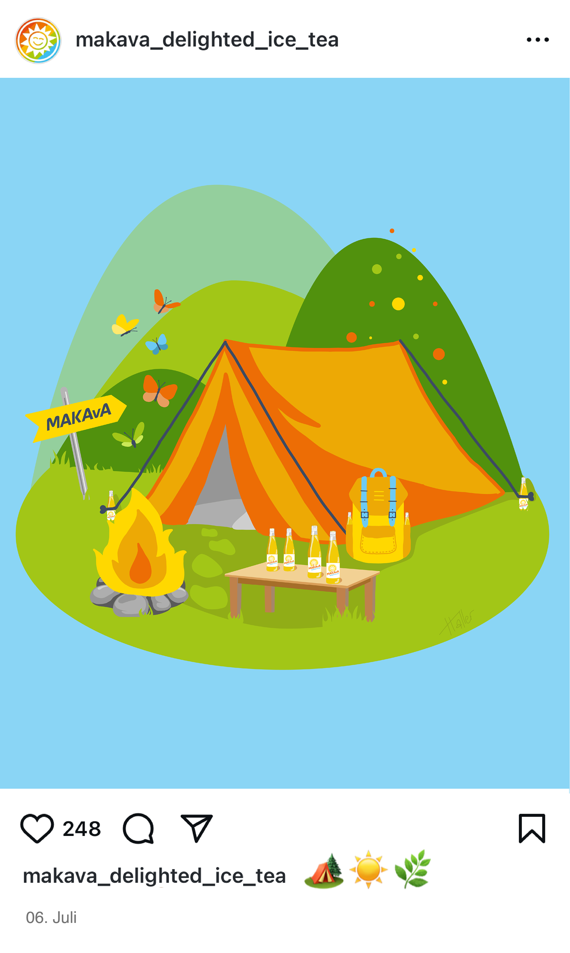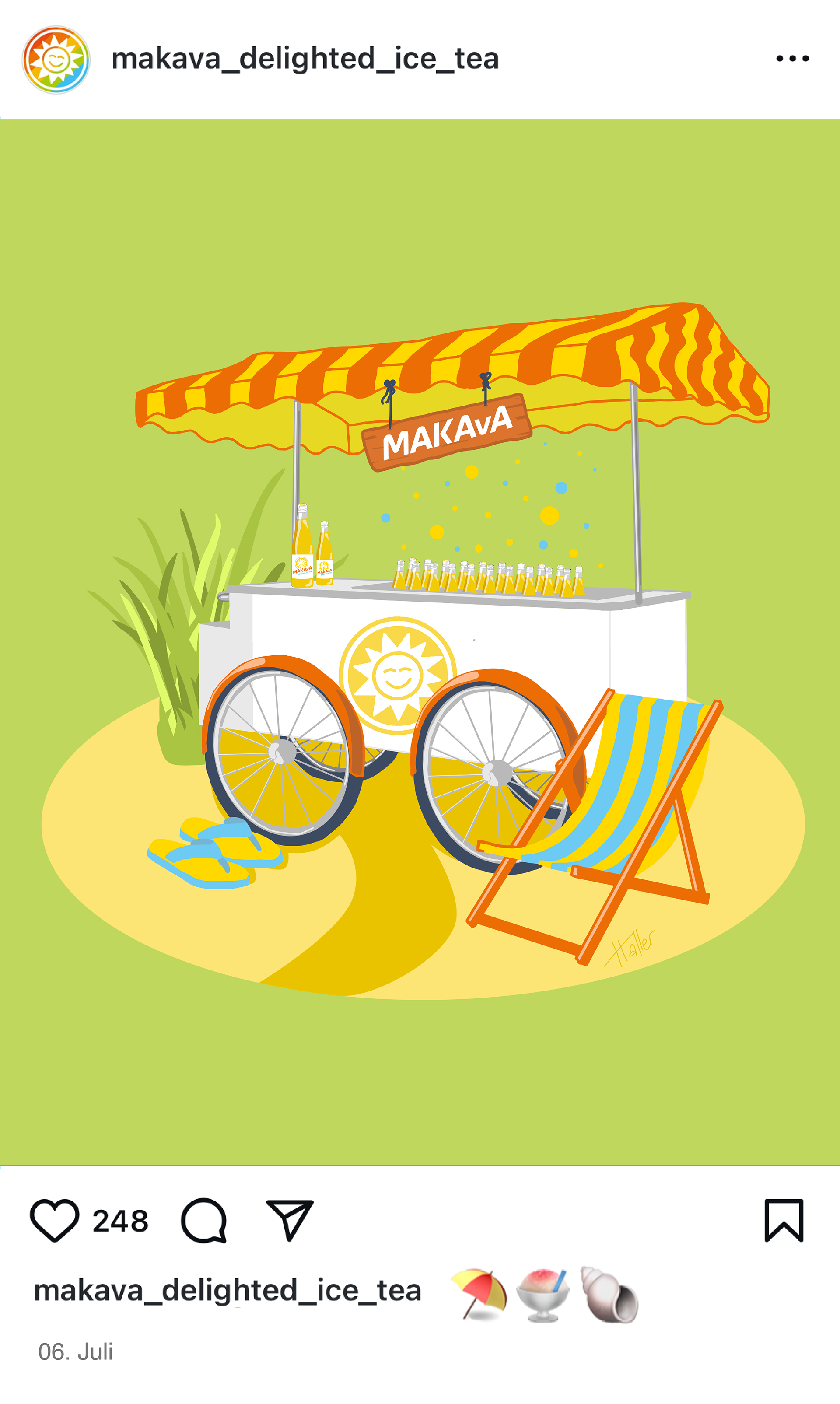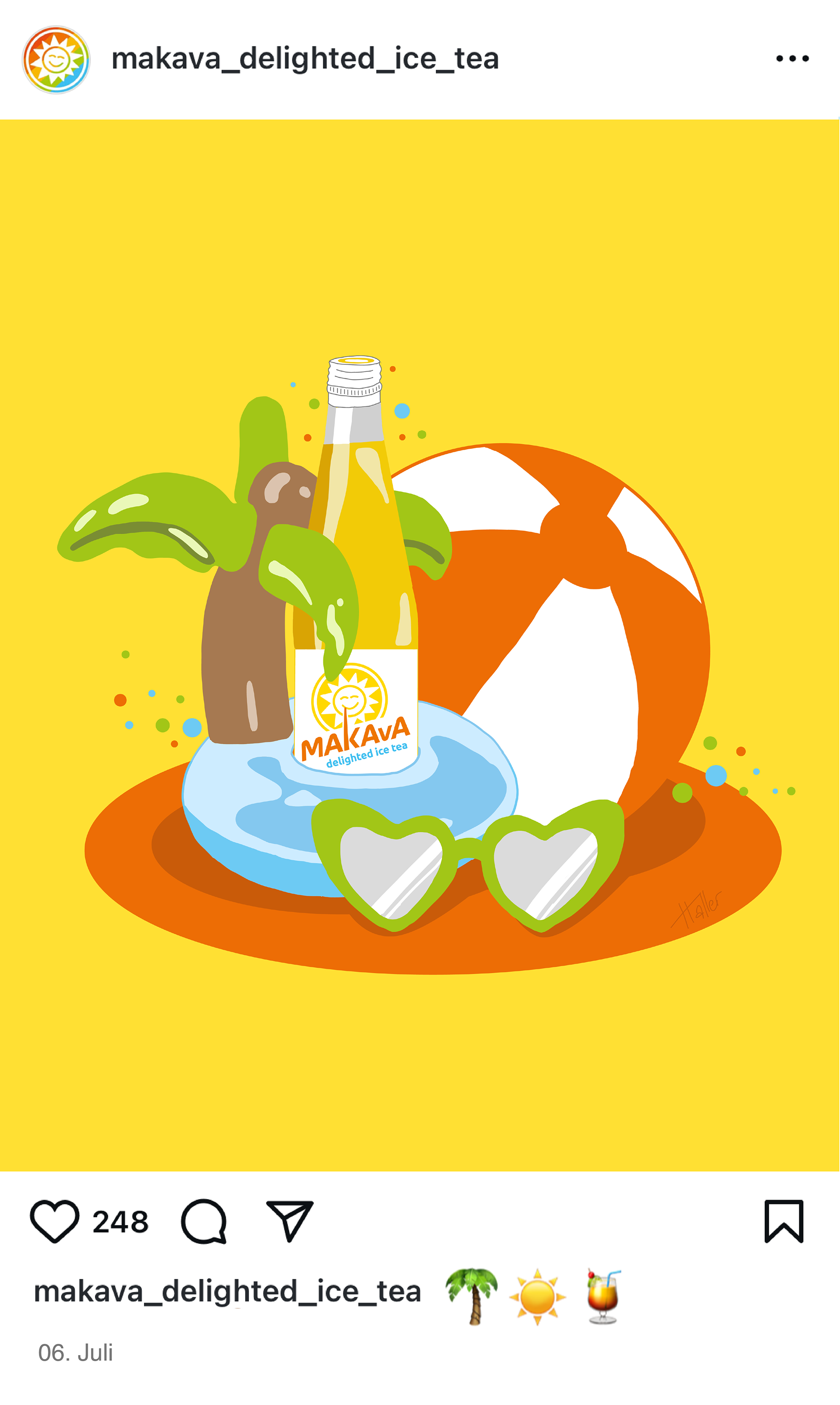 This year, alongside with my two colleagues Kathrin Allmer and Jasmin Murtinger, I had the opportunity to produce a summer campaign (for social media, focusing on Instagram) for MAKAvA delighted ice tea. The aim of the campaign was to showcase community activities in the surroundings and present the drink's hometown in all its summery beauty. The campaign included three illustrations (concept and implementation by me) as well as several photos (implementation and concept collaboratively, editing by me) and three short videos with animation (concept and implementation collaboratively, post-production of the video at Lendplatz by me).