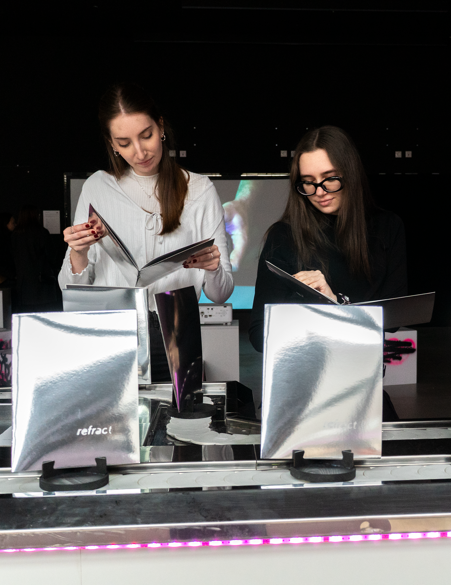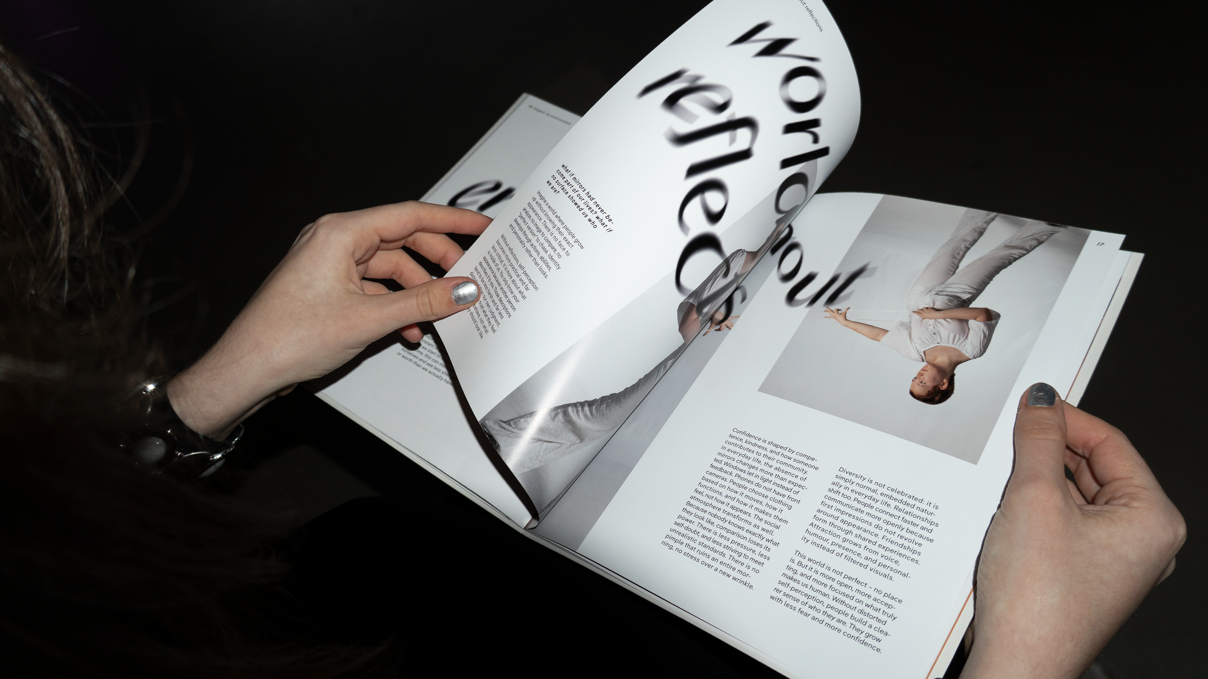 A broken mirror does not reflect (me). Refract deals with the distorted self-image, as individual as the person behind it. Our magazine on the subject is also unique. From texts to photos, concept, layout, and print finishing, everything is self-made, making each copy one of a kind. The terms “reflection,” “mirror,” and “distort” run through the entire project as key visuals. The magazine was presented at the “Crush” exhibition at FH Joanneum in Graz. Over four days, visitors were able to browse through the pages, reflect, think, exchange ideas, and experience the interactive elements using Artivive.